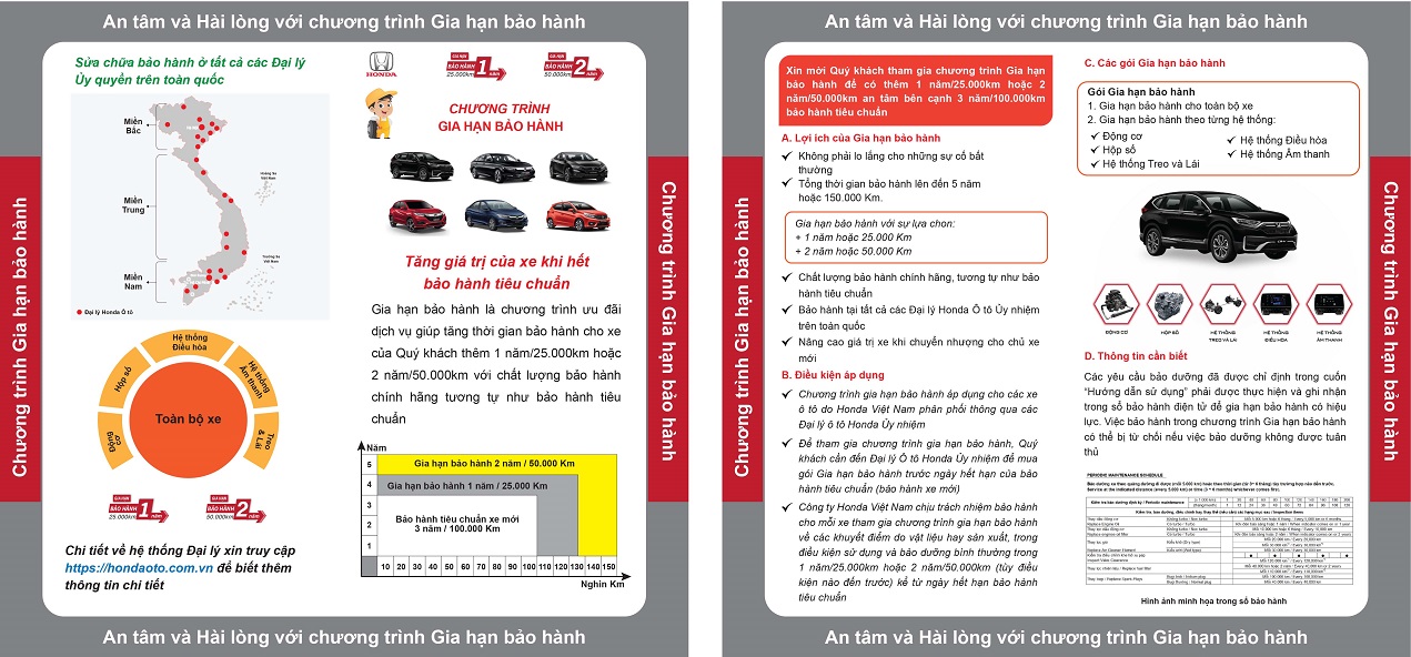 Chương trình gia hạn bảo hành là gói ưu đãi dịch vụ nhằm gia tăng thời gian bảo hành tiêu chuẩn của các dòng xe Honda thêm :
