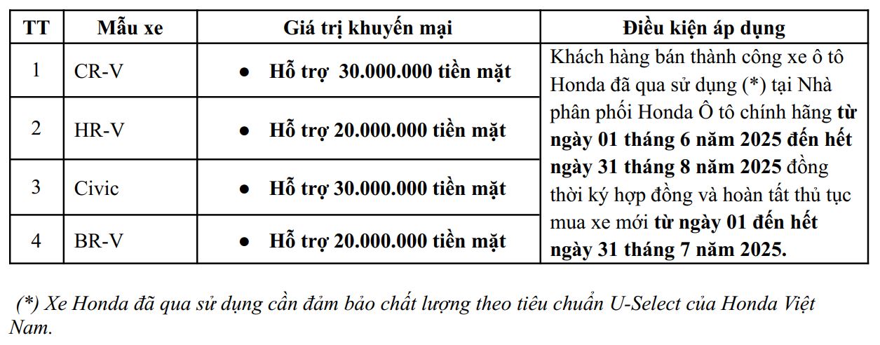 Nhằm cung cấp tới Quý khách hàng phương án giao dịch xe ô tô qua sử dụng minh bạch, thuận tiện, Honda Việt Nam đã triển khai Chương trình Xe qua sử dụng chính hãng. Từ ngày 01 tháng 07 năm 2025 đến hết ngày 31 tháng 7 năm 2025, HVN phối hợp cùng hệ thống Nhà Phân phối triển khai chương trình khuyến mại hấp dẫn cho khách hàng đổi xe mới chính hãng.