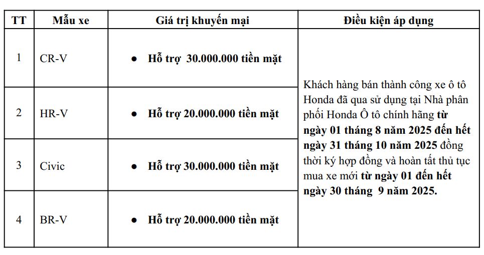 Nhằm cung cấp tới Quý khách hàng phương án giao dịch xe ô tô đã qua sử dụng minh bạch, thuận tiện, Honda Việt Nam đã triển khai Chương trình “Hỗ trợ siêu hời – Lên đời xế mới”. Từ ngày 01 tháng 09 năm 2025 đến hết ngày 30 tháng 9 năm 2025, HVN phối hợp cùng hệ thống Nhà Phân phối triển khai chương trình khuyến mại hấp dẫn cho khách hàng đổi xe mới chính hãng.