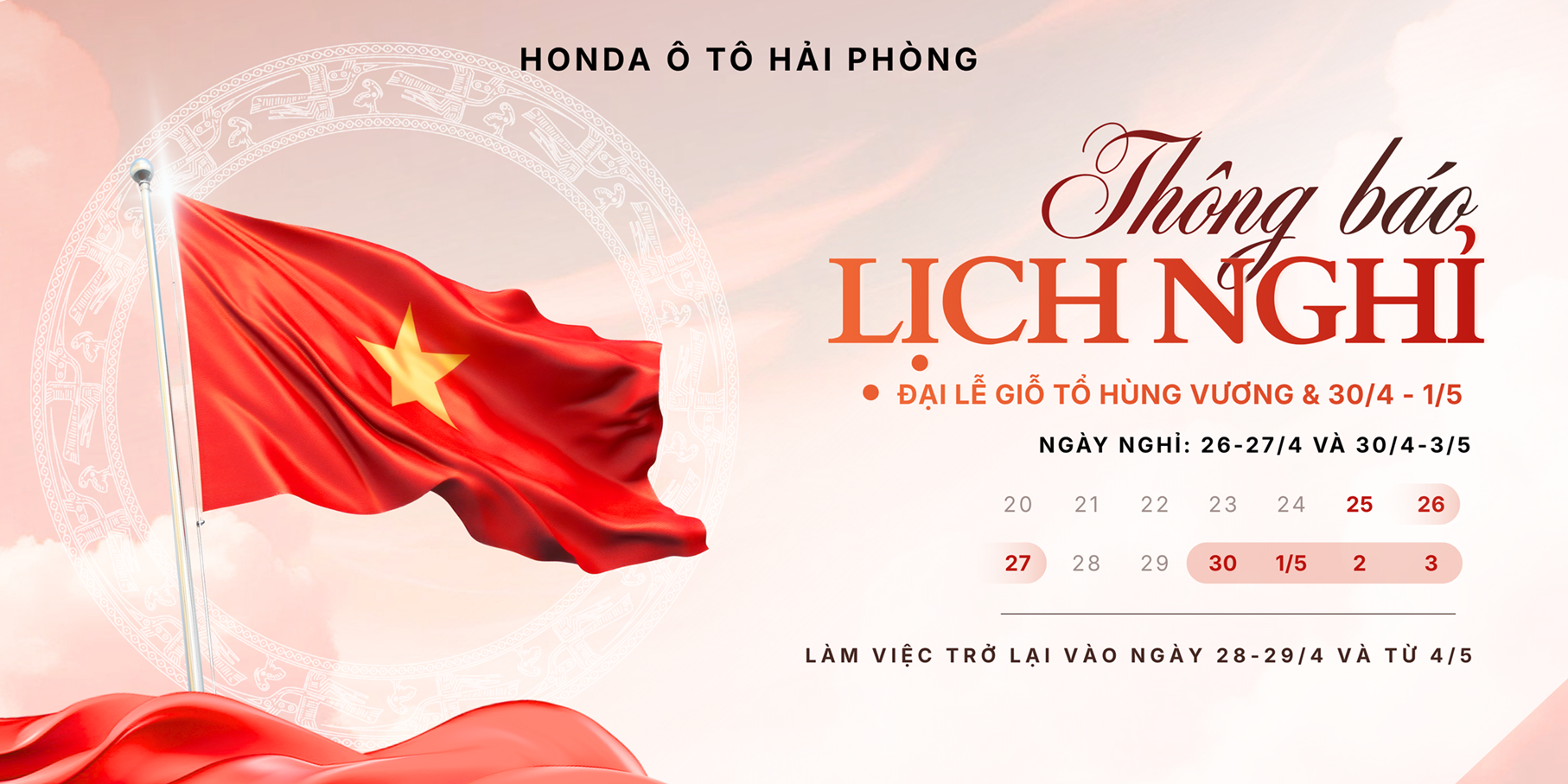 Honda Ô Tô Hải Phòng Thông Báo lịch nghỉ Lễ Giỗ Tổ Hùng Vương và Lễ 30/4 – 01/5 năm 2026